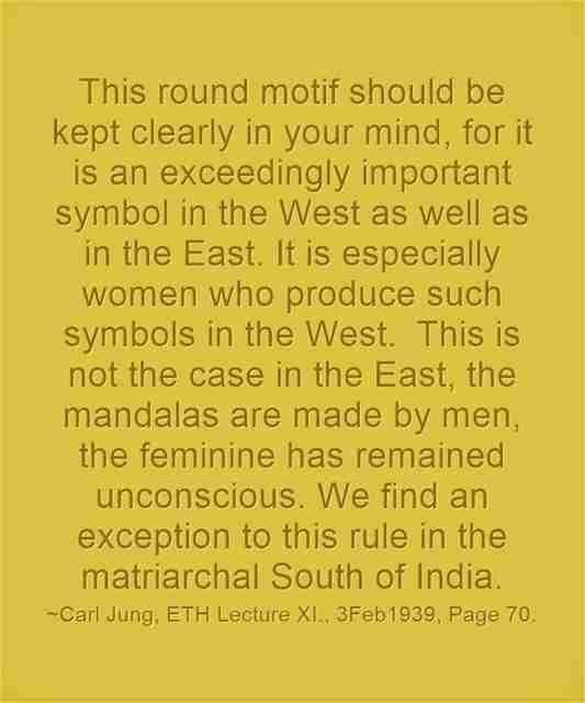This round motif should be kept clearly in your mind, for it is an exceedingly important symbol in the West as well as in the East. It is especially women who produce such symbols in the West. This is not the case in the East, the mandalas are made by men, the feminine has remained unconscious. We find an exception to this rule in the matriarchal South of India. ~Carl Jung, ETH Lecture XI., 3Feb1939, Page 70.