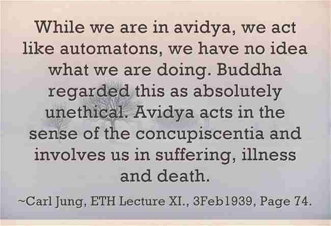 While we are in avidya, we act like automatons, we have no idea what we are doing. Buddha regarded this as absolutely unethical. Avidya acts in the sense of the concupiscentia and involves us in suffering, illness and death. ~Carl Jung, ETH Lecture XI, 3Feb1939, Page 74.