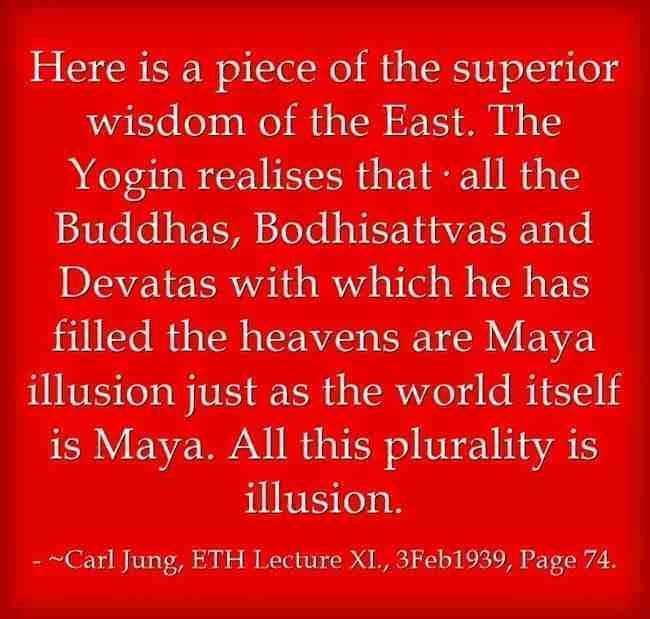 Here is a piece of the superior wisdom of the East. The Yogin realizes that all the Buddhas, Bodhisattvas and Devatas with which he has filled the heavens are Maya illusion just as the world itself is Maya. All this plurality is illusion. ~Carl Jung, ETH Lecture XI, 3Feb1939, Page 74.
