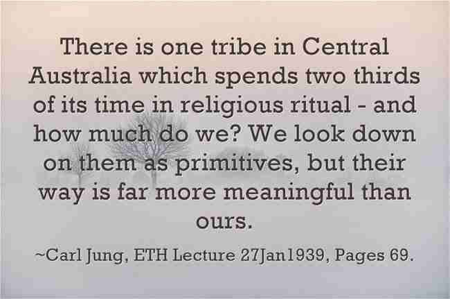 There is one tribe in Central Australia which spends two thirds of its time in religious ritual – and how much do we? We look down on them as primitives, but their way is far more meaningful than ours. ~Carl Jung, ETH Lecture 27Jan1939, Pages 69.