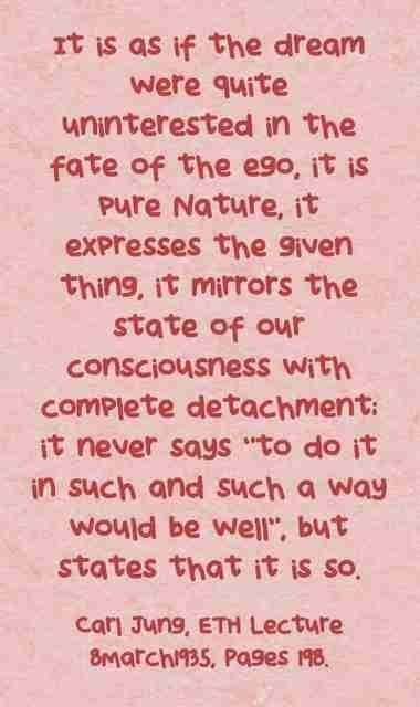 It is as if the dream were quite uninterested in the fate of the ego, it is pure Nature, it expresses the given thing, it mirrors the state of our consciousness with complete detachment; it never says “to do it in such and such a way would be well”, but states that it is so. ~Carl Jung, ETH Lecture 8March1935, Pages 198.