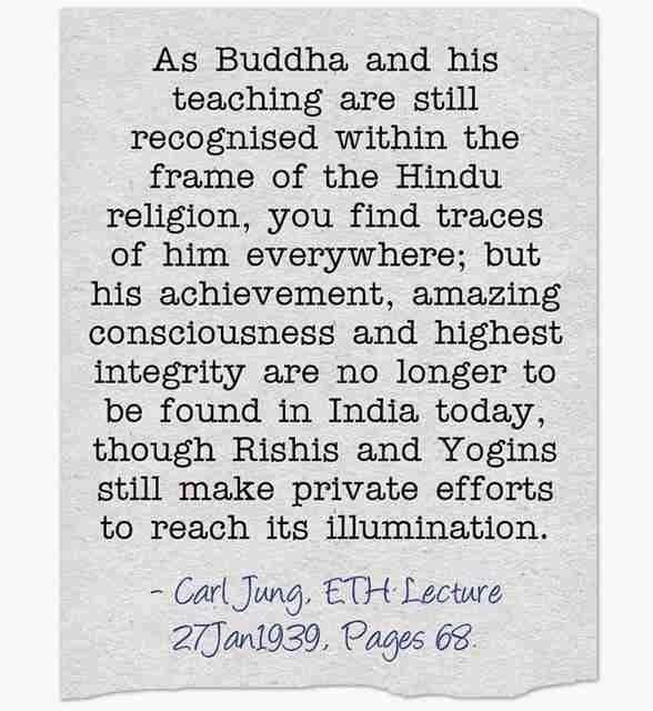 As Buddha and his teaching are still recognized within the frame of the Hindu religion, you find traces of him everywhere; but his achievement, amazing consciousness and highest integrity are no longer to be found in India today, though Rishis and Yogins still make private efforts to reach its illumination. ~Carl Jung, ETH Lecture 27Jan1939, Pages 68.