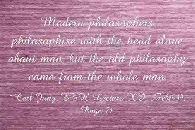 Modern philosophers philosophise with the head alone about man, but the old philosophy came from the whole man. ~Carl Jung, ETH Lecture XI, 3Feb1939, Page 71.