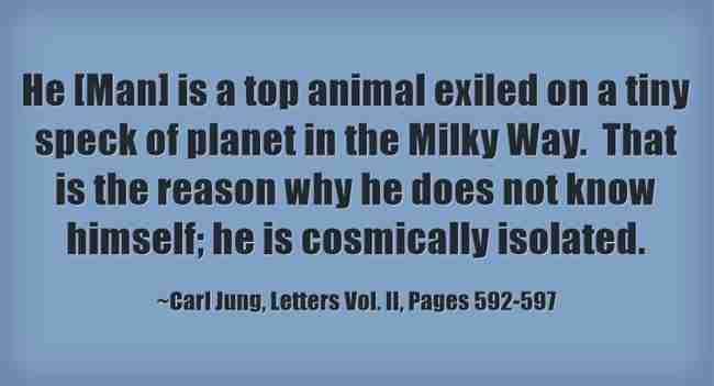 He is a top animal exiled on a tiny speck of planet in the Milky Way. That is the reason why he does not know himself; he is cosmically isolated. ~Carl Jung, Letters Vol. II, Pages 592-597