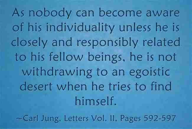 As nobody can become aware of his individuality unless he is closely and responsibly related to his fellow beings, he is not withdrawing to an egoistic desert when he tries to find himself. ~Carl Jung, Letters Vol. II, Pages 592-597