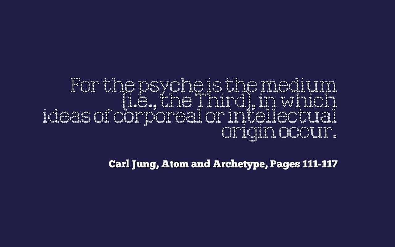 For the psyche is the medium” (i.e., the “Third”), in which ideas of corporeal or intellectual origin occur. ~Carl Jung, Atom and Archetype, Pages 111-117