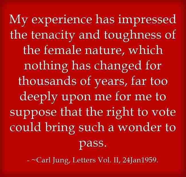 My experience has impressed the tenacity and toughness of the female nature, which nothing has changed for thousands of years, far too deeply upon me for me to suppose that the right to vote could bring such a wonder to pass. ~Carl Jung, Letters Vol. II, 24Jan1959.