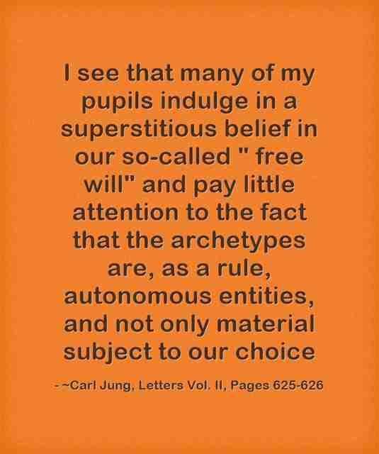 I see that many of my pupils indulge in a superstitious belief in our so-called ” free will” and pay little attention to the fact that the archetypes are, as a rule, autonomous entities, and not only material subject to our choice. ~Carl Jung, Letters Vol. II, Pages 625-626