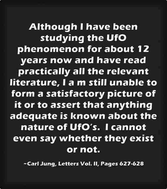 Although I have been studying the UfO phenomenon for about 12 years now and have read practically all the relevant literature, I a m still unable to form a satisfactory picture of it or to assert that anything adequate is known about the nature of UfO’s. I cannot even say whether they exist or not. ~Carl Jung, Letters Vol. II, Pages 627-628